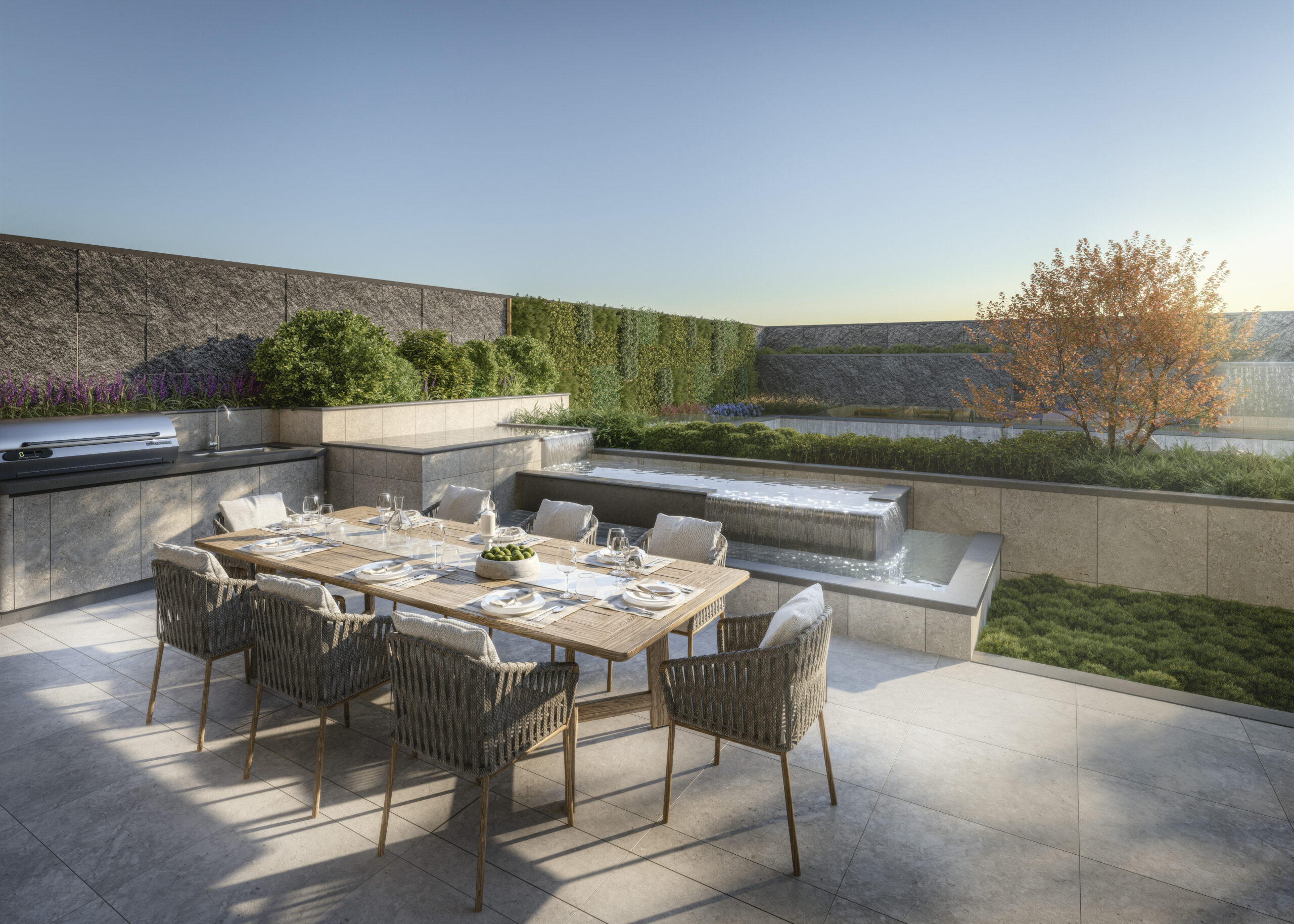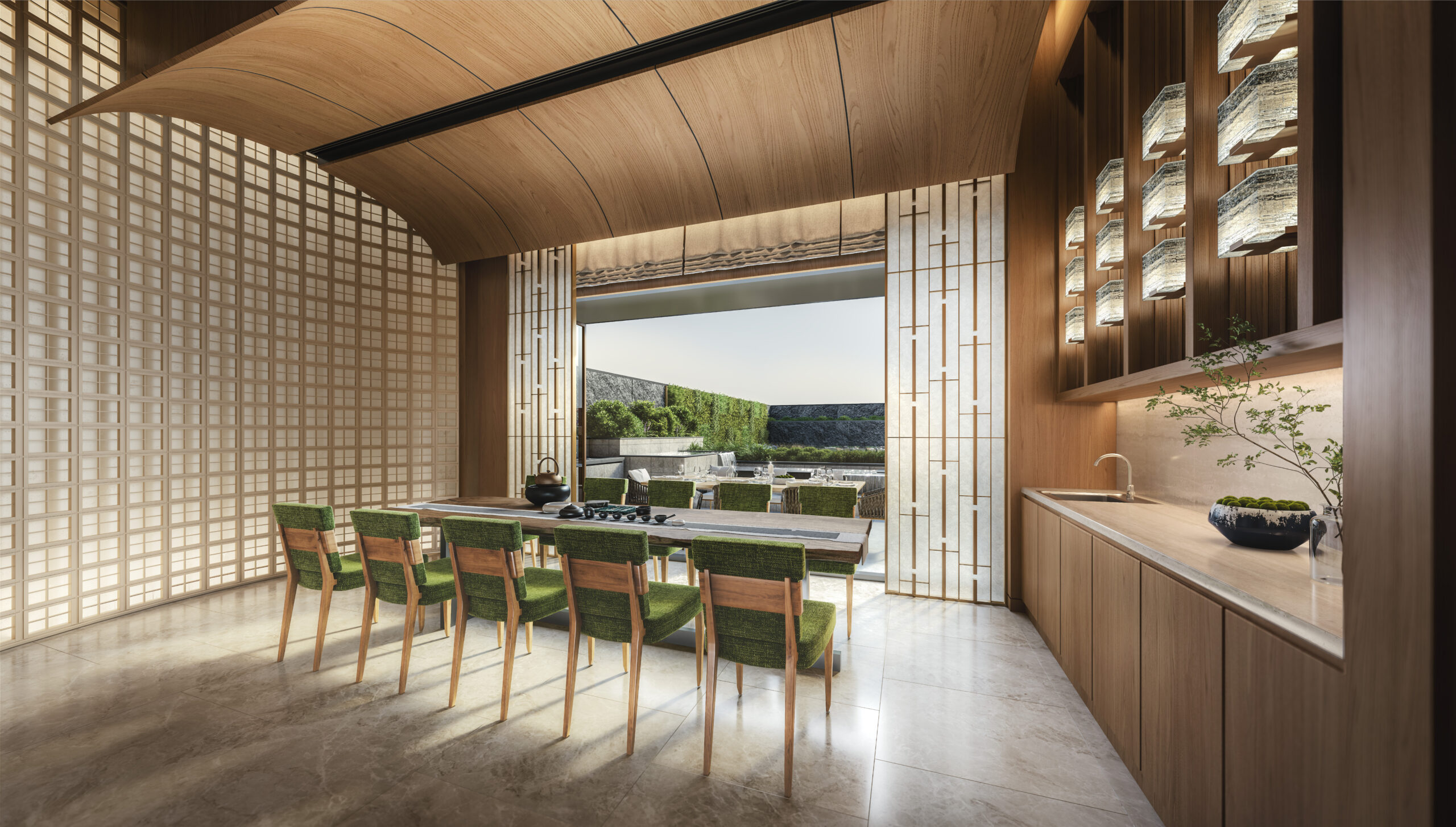 以⽇式御苑庭园为灵感,户外庭园 The Garden2的水景与绿意唤醒⾝⼼静韵。住户亦可畅泳于半山区3罕有约25米露天游泳池 The Pool2。